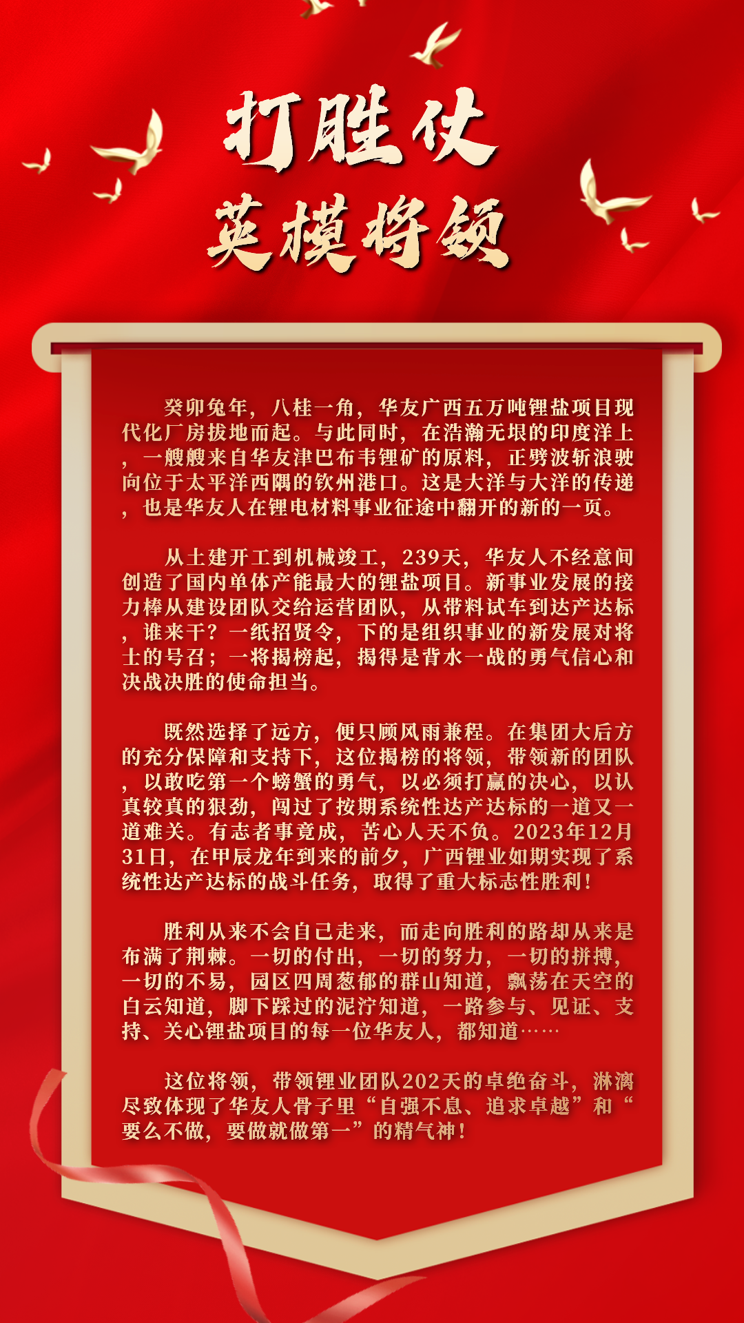 “敢打胜仗,能打胜仗,坚决打胜仗”一直以来都是新材料产业集团的优良传统。作为公司在新能源锂电材料行业的“先锋”和“新秀”,华友锂业碳酸锂产线快速达产达标为公司稳中求进、进中求胜高质量发展奠定了坚实的基础,也让我们更加坚定了对锂电行业前景的信心和决心。让我们珍惜荣誉,坚定信念,勇往直前,在奋斗中不断续写荣光,为实现“数一数二”的宏伟目标而不懈奋斗,迎接更加美好的未来,为锂电行业的发展、社会的繁荣进步,为中华民族的伟大复兴,做出我们华友人的贡献!