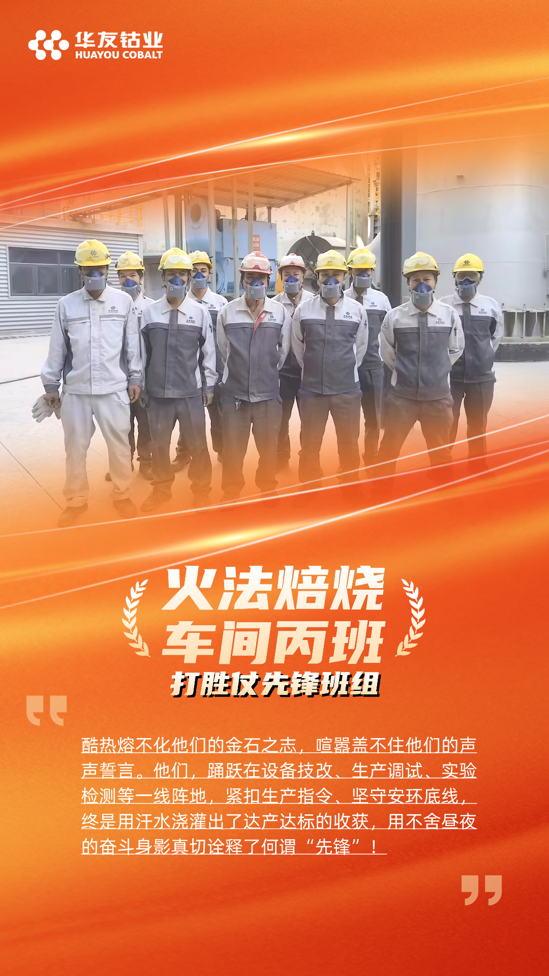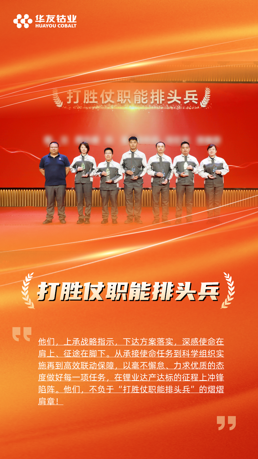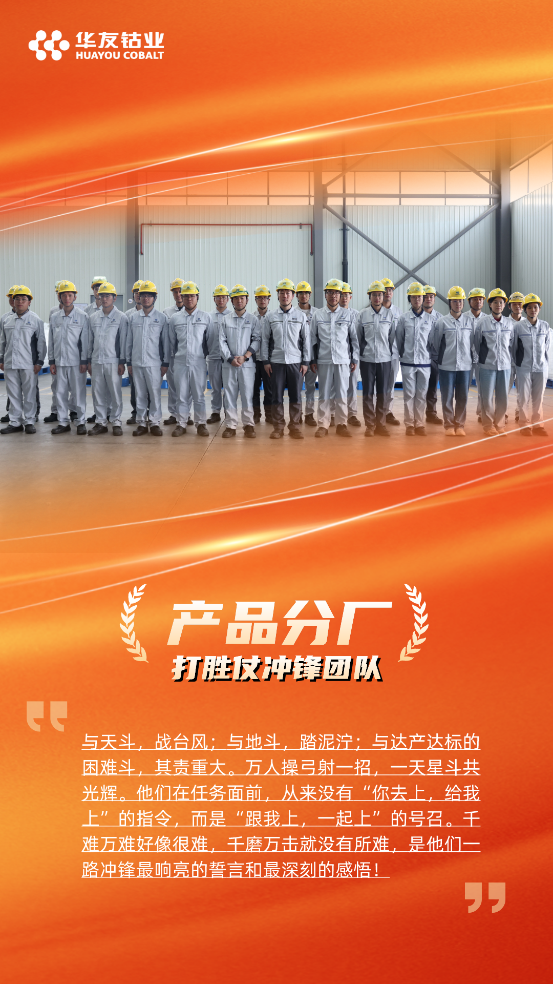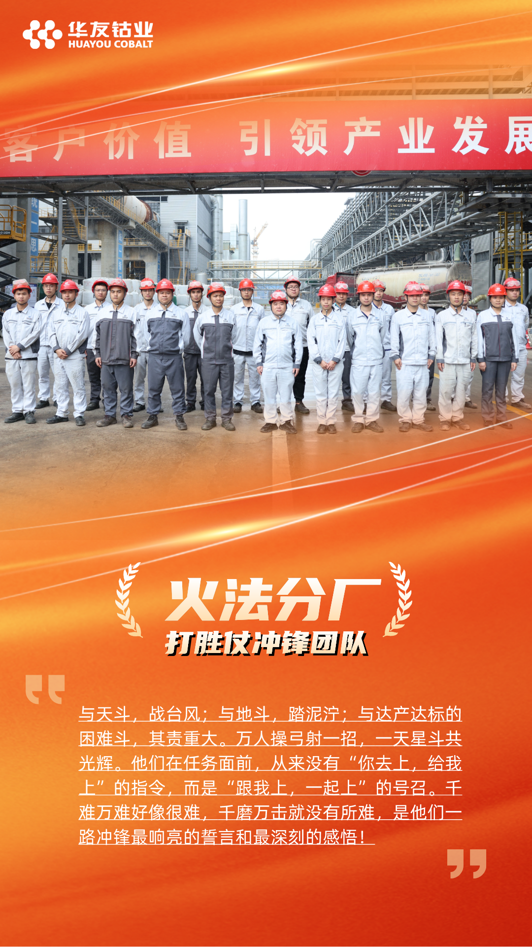 “打胜仗冲锋团队”颁给了火法分厂和产品分厂,他们在华友锂业达产达标的征程上,以高度的责任心和精湛的技能,出色的组织能力和高效的执行力,确保了产线的稳定高效运行,为达产达标贡献了重要力量。