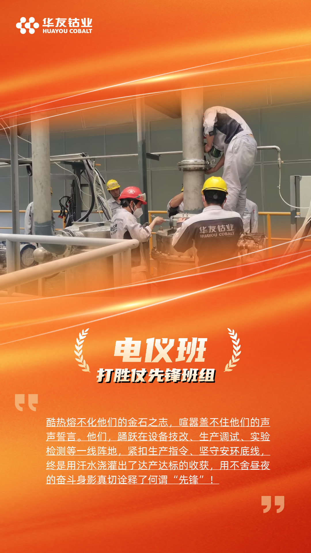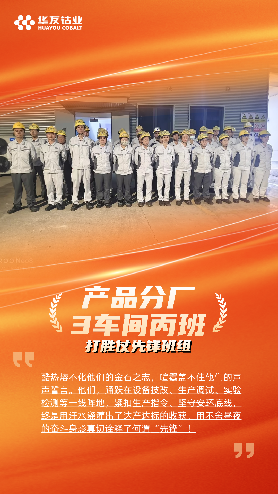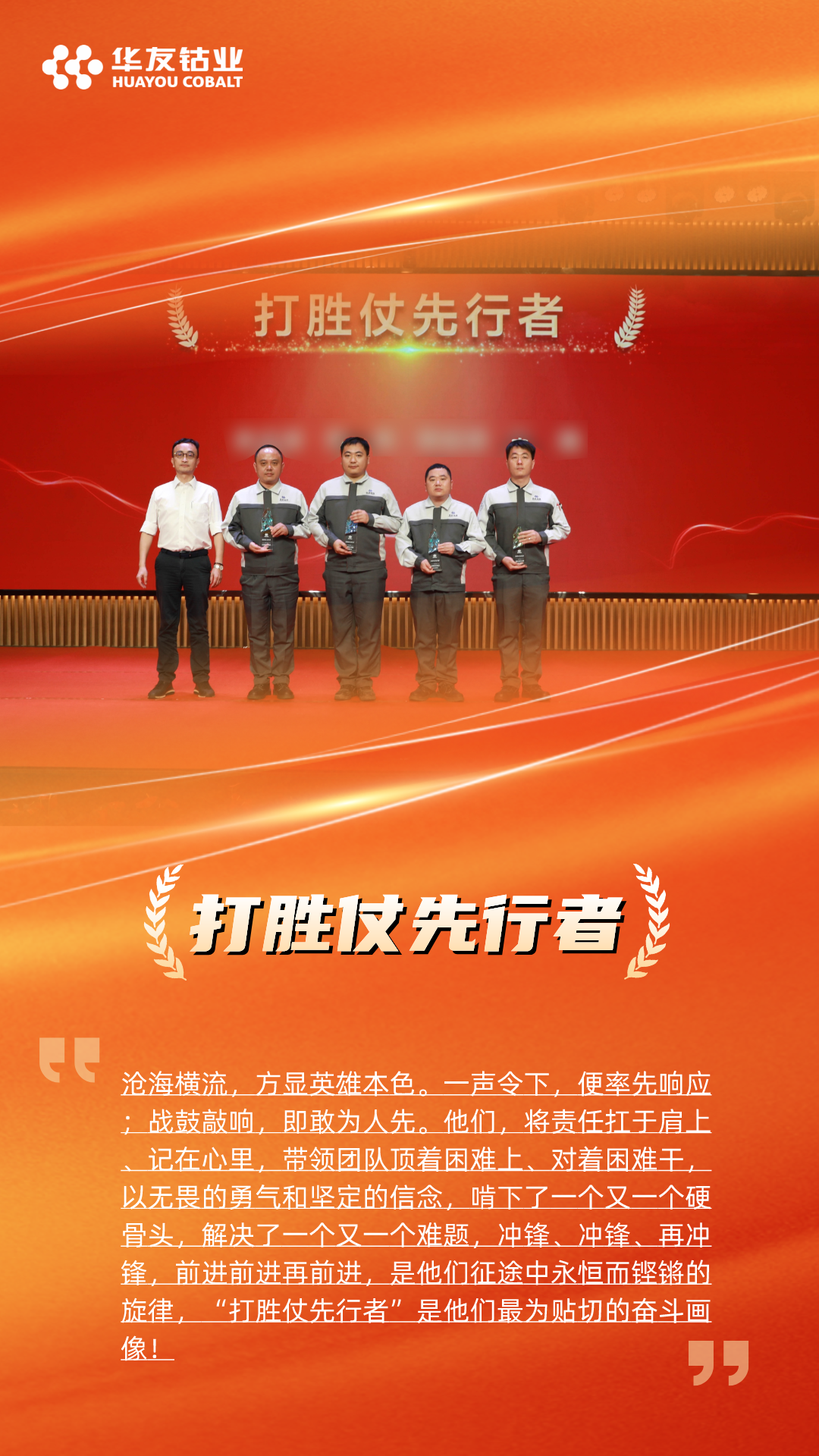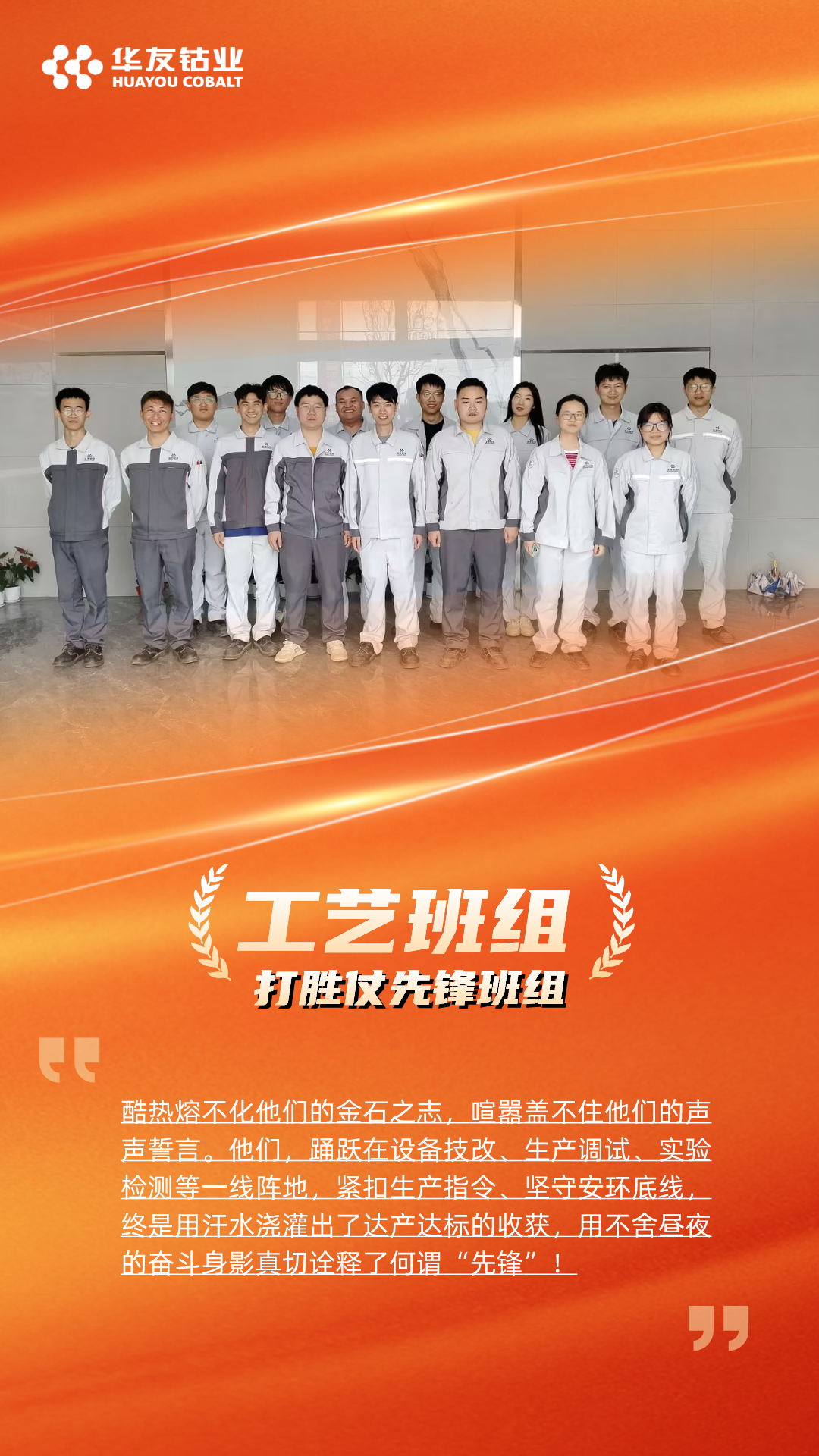 “打胜仗冲锋团队”颁给了火法分厂和产品分厂,他们在华友锂业达产达标的征程上,以高度的责任心和精湛的技能,出色的组织能力和高效的执行力,确保了产线的稳定高效运行,为达产达标贡献了重要力量。