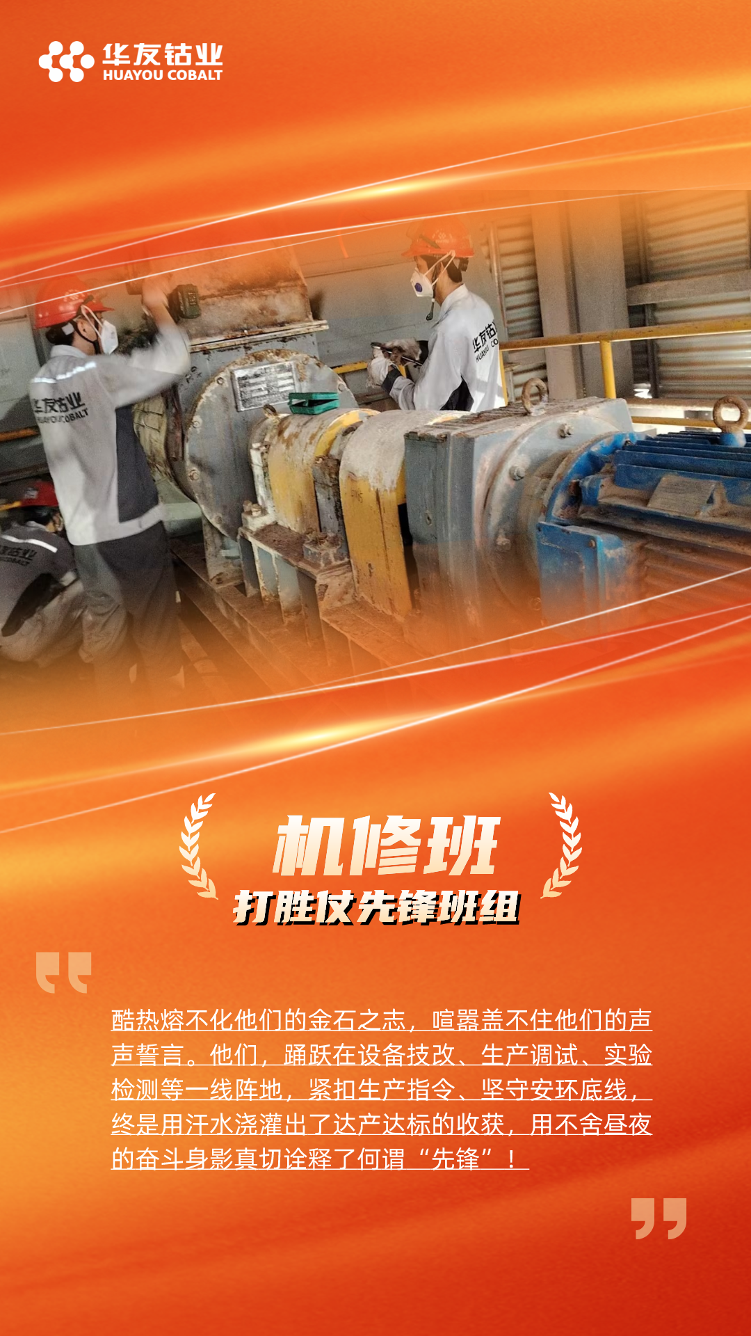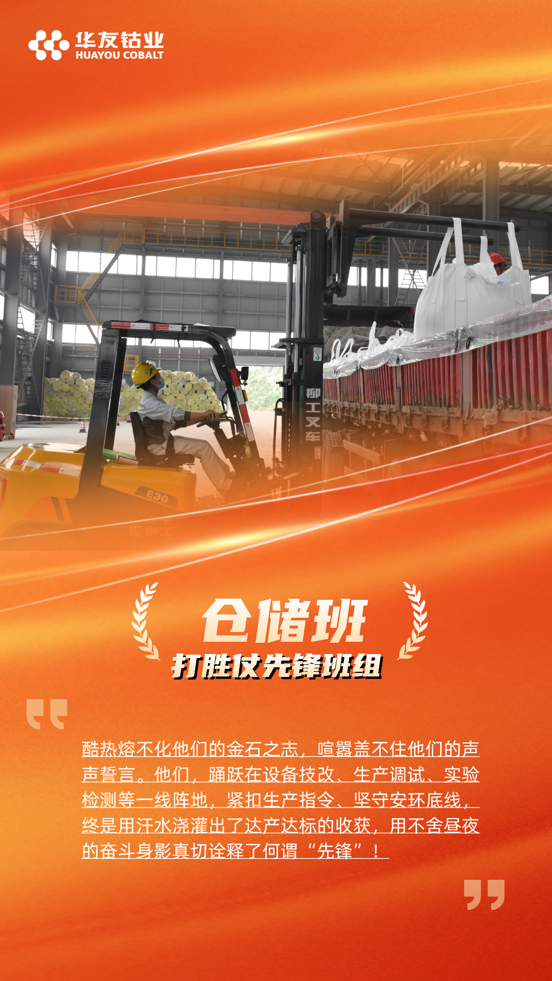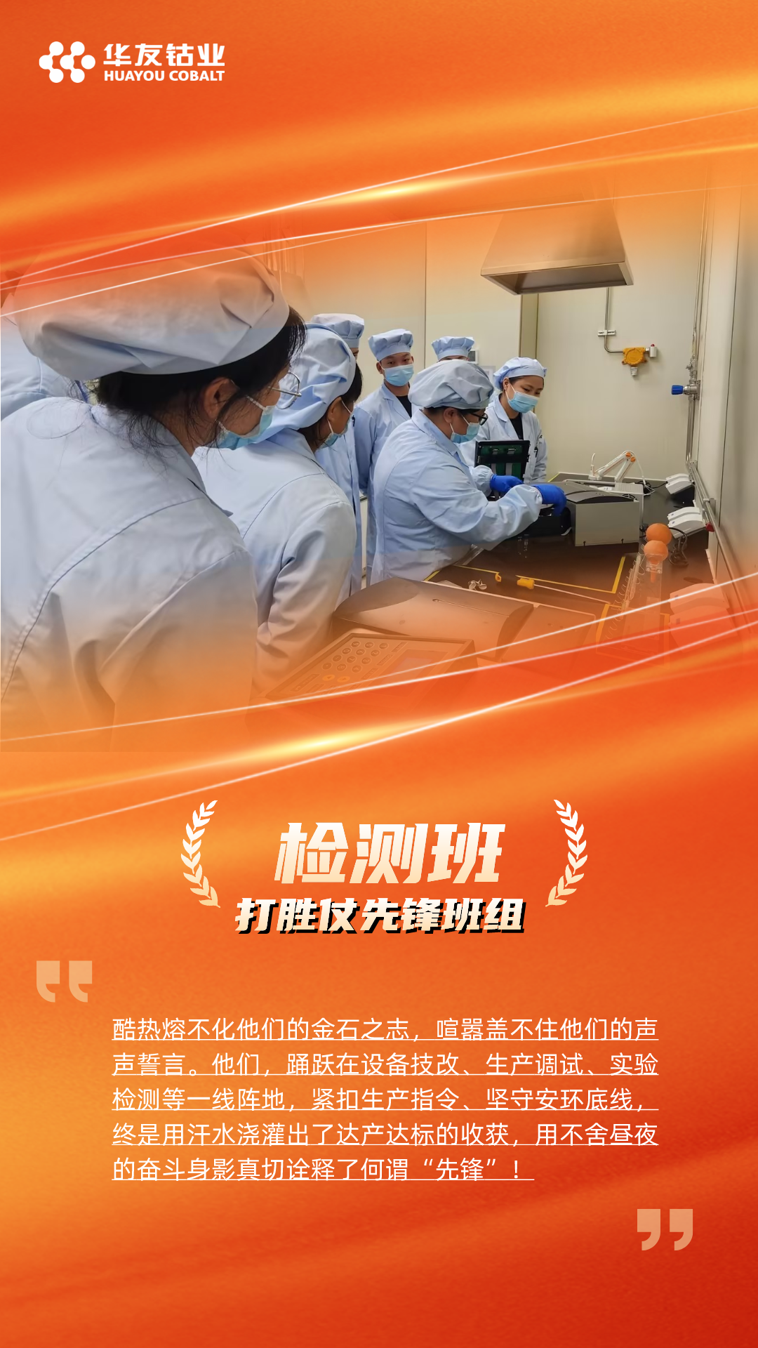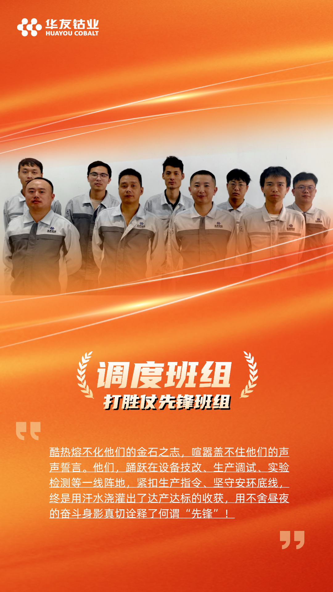 “打胜仗冲锋团队”颁给了火法分厂和产品分厂,他们在华友锂业达产达标的征程上,以高度的责任心和精湛的技能,出色的组织能力和高效的执行力,确保了产线的稳定高效运行,为达产达标贡献了重要力量。