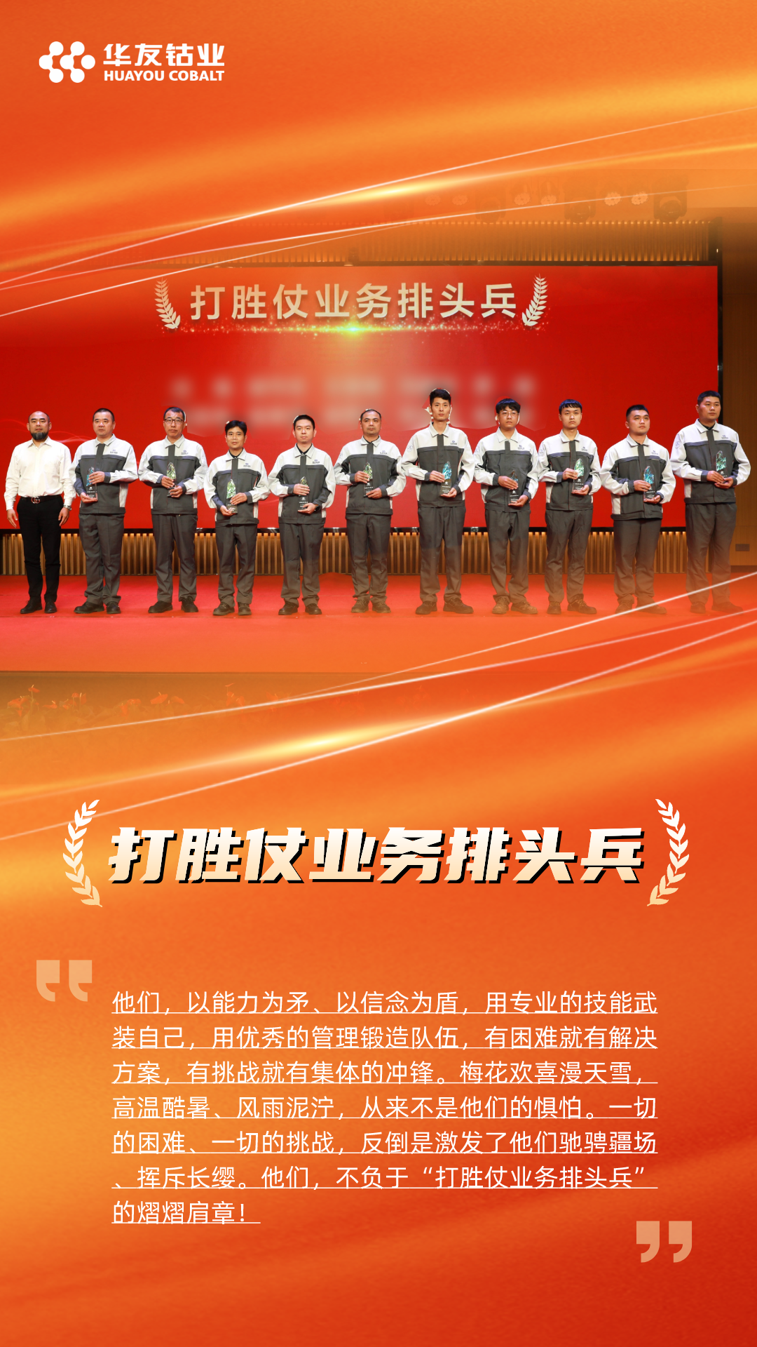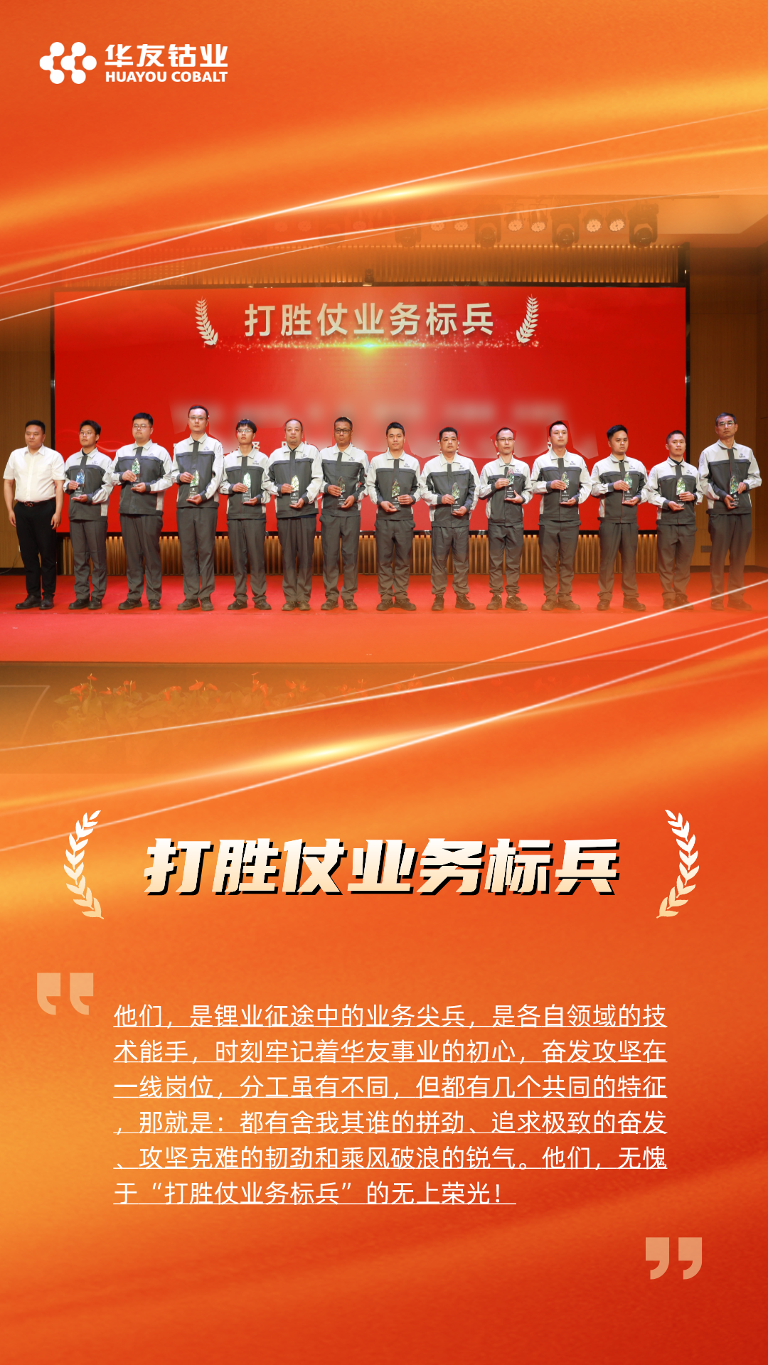 大会还颁发了先进个人奖项,4名干部获评“打胜仗先行者”奖、10名骨干获评“打胜仗业务排头兵”奖、13名业务能手获评“打胜仗业务标兵”奖、6名管理干部获评“打胜仗职能排头兵”奖、9名后勤职能人员获评“打胜仗职能标兵”奖。他们不仅为锂业的发展做出了重要贡献,也为新材料全体干部员工树立了榜样。正是这些优秀的团队和个人,共同创造了华友锂业“打胜仗”的成就。